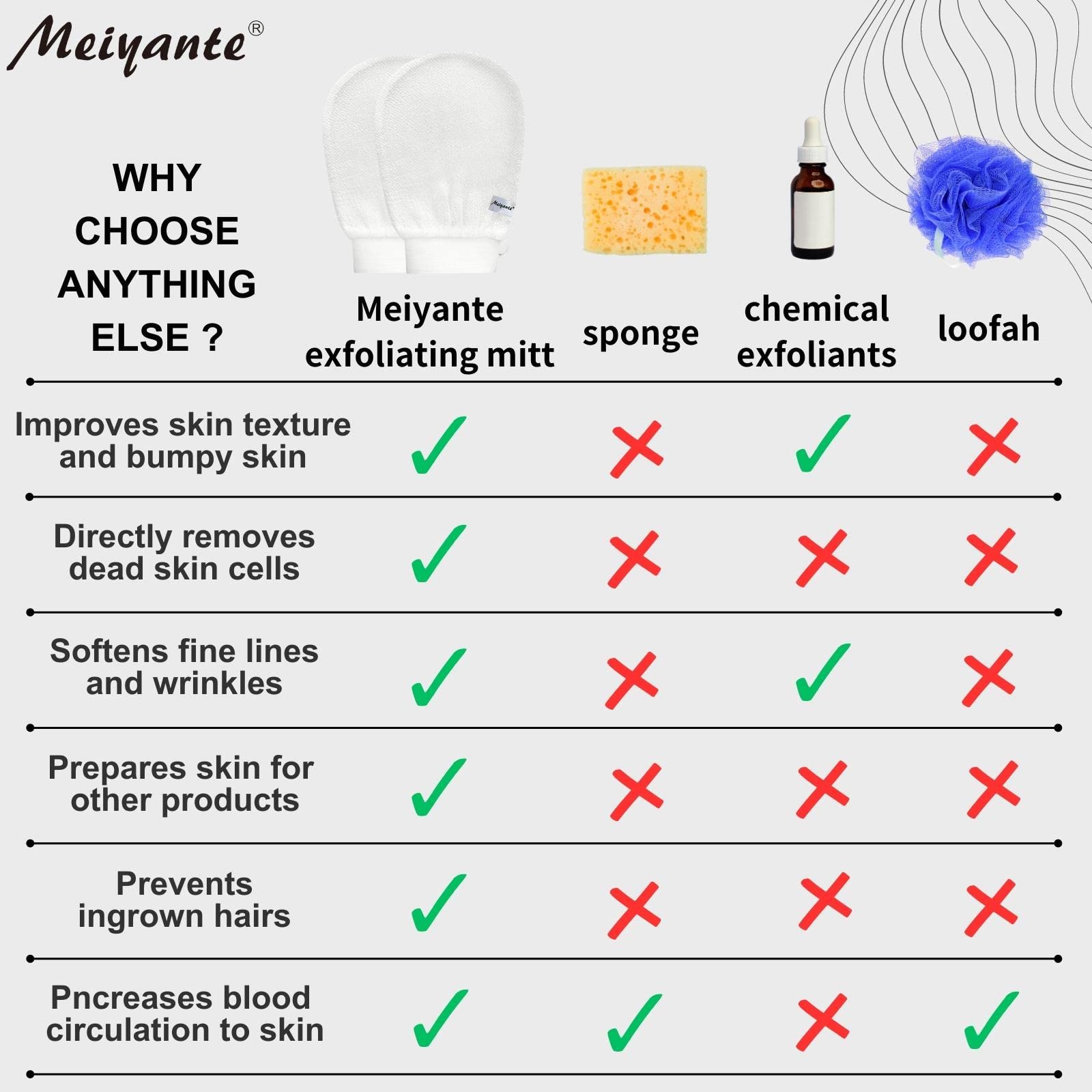 - ✅ Way Better than Loofahs or Chemical Exfoliants - Loofahs and chemical exfoliants don’t have the skin-gripping power of our viscose shower exfoliators, meaning they’re not as good at removing dead skin. Our mitts are rough enough to exfoliate deep, while soft enough to buff and smooth.